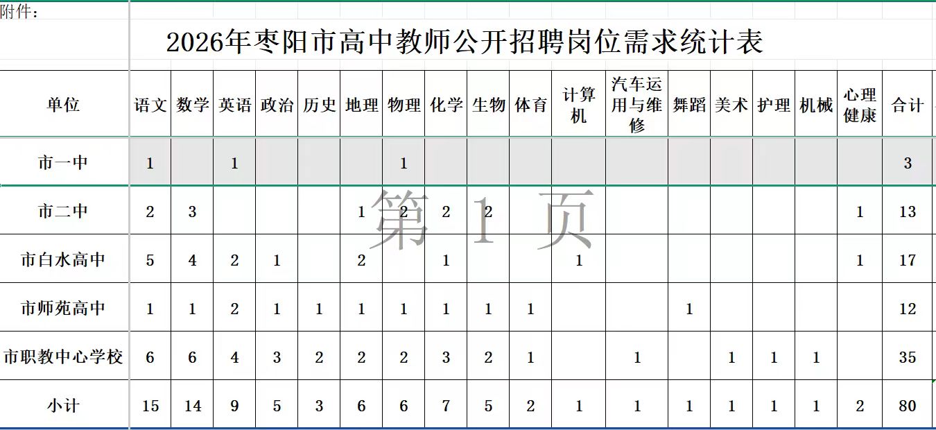 2026年枣阳市高中教师招聘计划80个,拟采用笔试+面试的方式公开招聘,相关公告拟于近期在枣阳人事考试网发布。数学、物理、生物、地理、化学等是高中紧缺学科;护理、汽修是职业教育紧缺专业,欢迎广大学子踊跃报名。